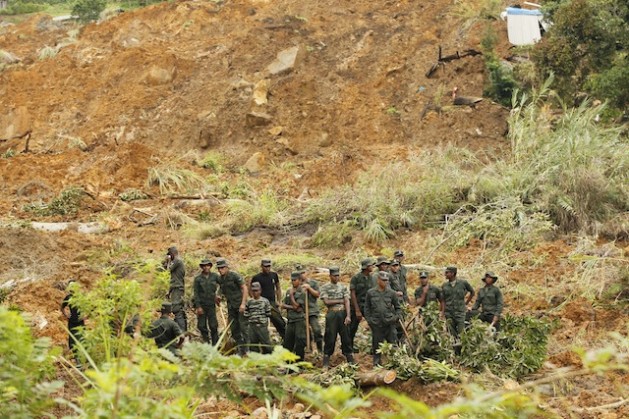 Soldiers wait for instructions before they begin search operations at the Meeriyabedda landslide site in central Sri Lanka. Credit: Contributor/IPS