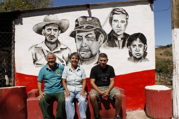 Florentino Menjívar (left), his wife María Dolores Gómez, and Víctor Manuel Escalante at the foot of a mural showing prominent figures from El Salvador’s civil war, in Dimas Rodríguez, a settlement of former insurgents in the town of El Paisnal, which is tapping into “guerrilla tourism”. Credit: Edgardo Ayala/IPS