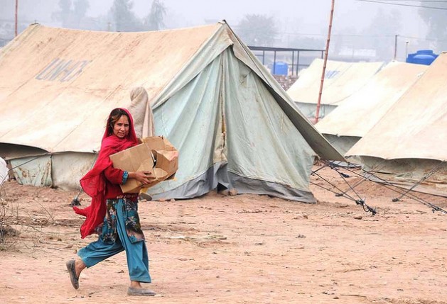 A child carries a box of relief supplies to her tent at the Mardan refugee camp in Pakistan. Credit: Ashfaq Yusufzai/IPS