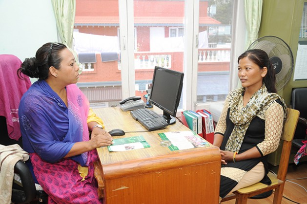 Dawa Dolma Tamang (right) visits the Pourakhi office regularly to learn about upcoming training opportunities. Credit: Pradeep Shakya/UN Women