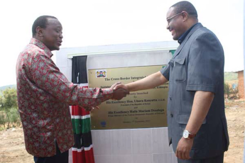 President Kenyatta of Kenya and Prime Minister Hailemariam Desalegn lay the foundation for the Kenya-Ethiopia cross border program in the border town of Moyale on 07 Dec 2015. Photo Courtesy of PPS