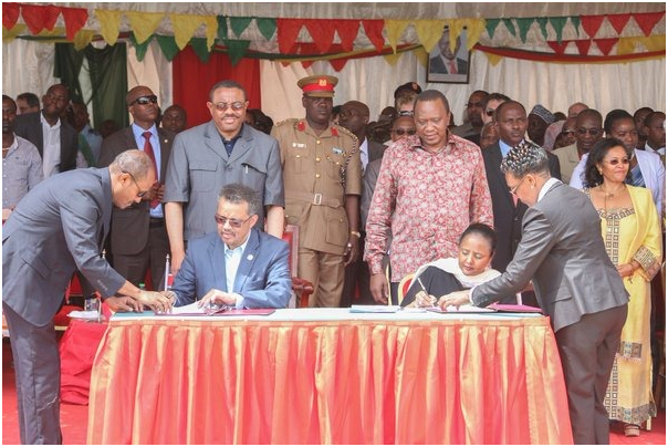 President Uhuru Kenyatta and Ethiopian Prime Minister Hailemariam Desalegn witness as former Foreign Minister Ethiopia, Tedros Adhanom and Foreign Minister Kenya, Amb Amina Mohamed sign an MOU to create jobs, reduce poverty and foster trade in their restive borderlands, where conflict had intensified in recent years. Photo: UN Kenya