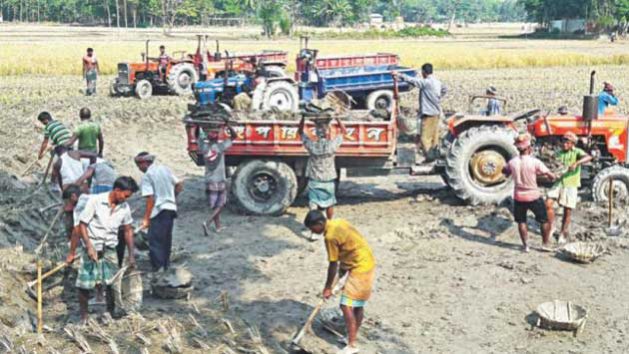 Workers hired by a kiln owner collect topsoil from a farmland at Doljor village in Aditmari upazila of Lalmonirhat. Photo: S Dilip Roy