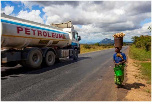 A Tanzanian woman walks to the market as a petrol lorry passes by. Credit: Alamy /Wietse Michiels Travel Stock
