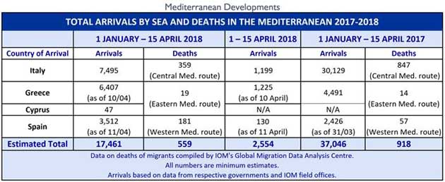 The 559 deaths on the three Mediterranean Sea routes so far this year compare with 918 at this time in 2017, a decline of about 40 per cent year-on-year.