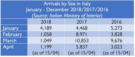Last year, during the first 15 days of April, 5,837 men, women and children arrived in Italy on this route; in 2016 the total for the first 15 days of April was 3,023. This year’s April total this far comes to less than one-fifth of 2017’s volume and just over one third of the 2016 total (see chart below).