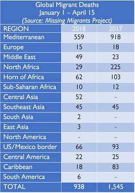 Worldwide, IOM’s Missing Migrants Project has recorded 938 deaths and disappearances during migration in 2018. On the US/Mexico border, 66 migrants are estimated to have died this year. Most recently, the remains of two men were recovered by Mexican civil protection authorities from the Río Bravo in Nuevo Laredo, Mexico: they drowned on 12 April when attempting to cross to the US.