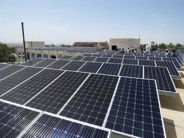 School rooftop in Sana’a being fitted with solar panels. Credit: Saba Malme/IOM 2018