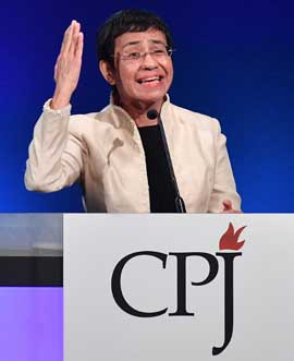 Maria Ressa--founder, CEO, and executive editor of the Rappler news website--giving her acceptance speech at CPJ's 2018 International Press Freedom Awards on November 20, 2018. (Getty Images/Dia Dipasupil)