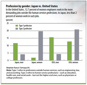 The research showed that in Japan, the proportion of women in the latter category is remarkably low: in the United States, 12.7 percent of female employees are in Type-I professions, compared with fewer than 2 percent of Japanese female employees (see chart). Women’s jobs in Japan are clearly concentrated in Type-II professions.