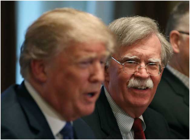 National Security Advisor John Bolton (R), listens to President Donald Trump during a briefing from senior military leaders, in the Cabinet Room on April 9, 2018. (Photo by Mark Wilson/Getty Images)