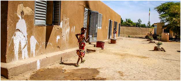 A girl runs outside a small community school in Korioume, Mali, where children lack basic equipment, including notepads and pens. Parts of the school have been attacked and in 2013 the village was a Jihadist stronghold. Credit: OCHA/Eve Sabbagh