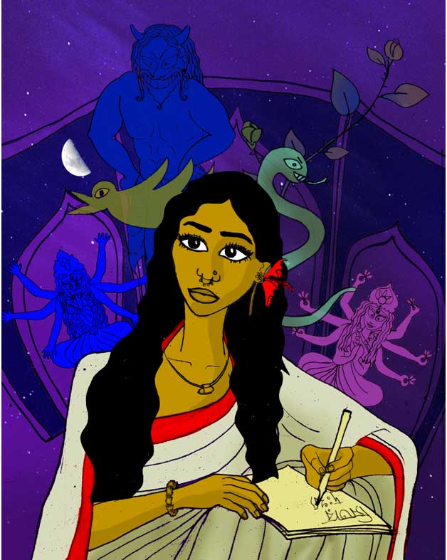 Chandrabati illustrated by Inshra Sakhawat Russell, part of HerStories:Adventures of Supergirls book on trailblazing women from Ancient Bengal and present day Bangladesh. Credit: HerStory Foundation