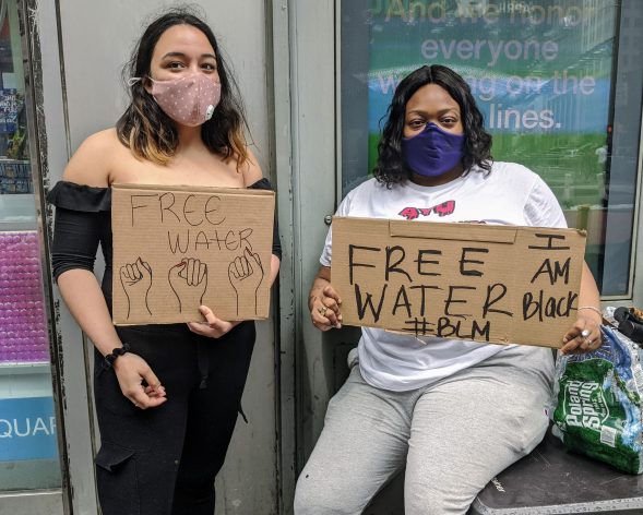 Zekiya Louis (R) and Manuela Ramirez (L) handing out free water to protesters in Times Square, New York. Credit: James Reinl/IPS