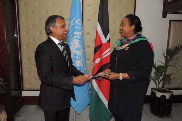 Former Ministry of Foreign Affairs Cabinet Secretary Amina Mohamed receiving credentials from newly Appointed UNDP Resident Representative and UN Resident Coordinator Siddharth Chatterjee, at her office in 2016. Credit: UNDP Kenya