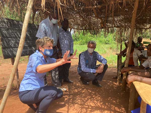 ECW Director Yasmine Sherif visits the Modale ‘Settlement of Hope’ with UN High Commissioner for Refugees Filippo Grandi in the Democratic Republic of the Congo.