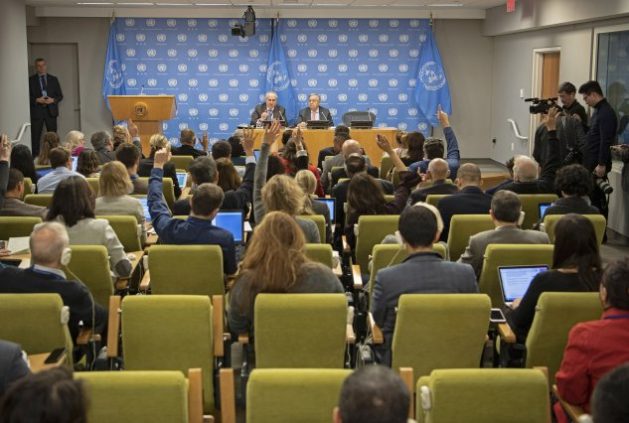 Secretary-General António Guterres briefing journalists in a pre-pandemic era. At left is his Spokesman Stéphane Dujarric. Credit: UN Photo/Manuel Elias