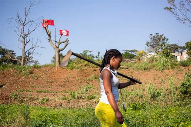 Sbongile Tabhethe works in the food garden at eKhenana land occupation in Cato Manor, Durban, 9 June 2020. Credit: New Frame / Mlungisi Mbele