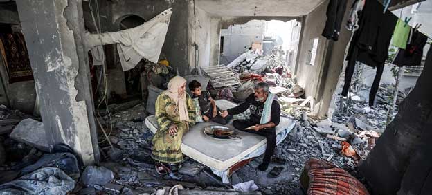 A family cooks in the rubble of their home in the Gaza Strip. Credit: WFP/Ali Jadallah