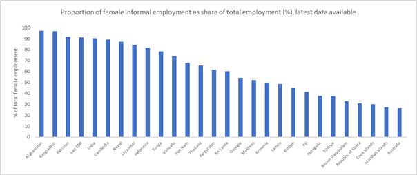 Contributory schemes and their accompanying income security are out of reach for female informal workers, ranging from 97.3 per cent of total female employment in Afghanistan to just over one quarter in Australia (Figure 1).