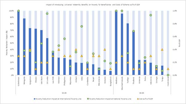 It demonstrates that introducing universal non-contributory maternity benefits at a basic benefit level for a duration of 18 weeks can ensure that a majority of newborn mothers do not have to raise their infants in poverty.