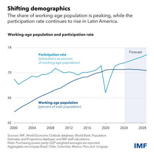 Policies can help. Expanding childcare programs and providing more training for women can help raise female participation, as we have discussed in recent country reports, including for Brazil and Mexico.