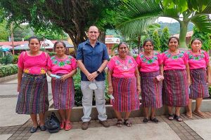 Jorge Lemus, director of El Salvador’s Náhuat/Pipil Language Revitalization Program and the driving force behind the Náhuat Cuna project, which teaches the language to children between the ages of three and five, is photographed with indigenous women of the Pipil people in Nahuizalco in western El Salvador. CREDIT: Don Bosco University