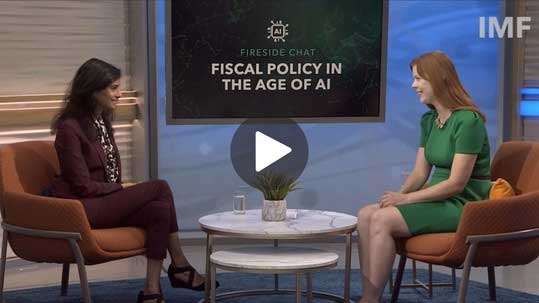 IMF’s First Deputy Managing Director Gita Gopinath’s fireside chat with Washington Post columnist Heather Long on the findings of a new Staff Discussion Note (SDN) by the Fiscal Affairs Department, which explores the role fiscal policy can play in maximizing the opportunities of AI, as well as containing the risks. Credit: IMF