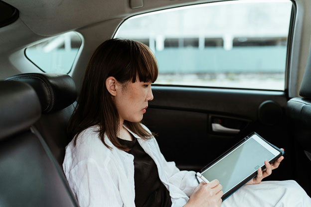 A woman is working on her tablet while commuting to her office. ICT Connectivity in cities is essential to ensure that people can work anywhere. Credit: Pexels/ Ketut Subiyanto