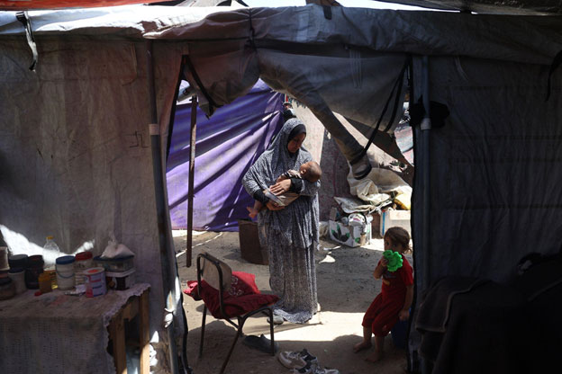 Madeline, a mother from Gaza, stands in her tent holding her child in her arms. Credit: UNICEF/Eyad El Baba