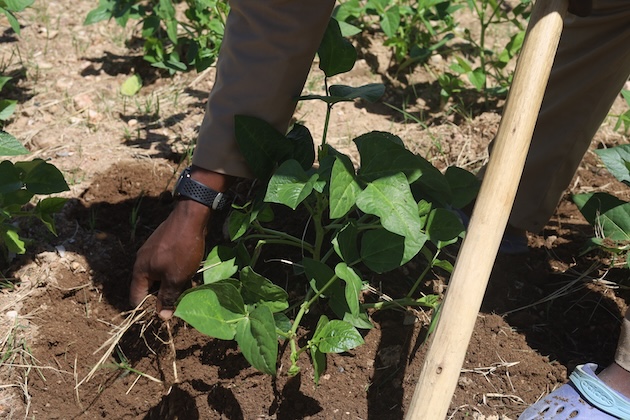 Takudzwa Saruwaka removing weeds from a cowpea plant at Matondo Growth Point, outside Mutare. Credit Farai Shawn Matiashe