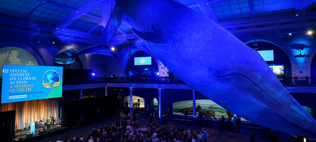 The iconic blue whale looms over the Milstein Hall of Ocean Life at the American Museum of Natural History. Credit: UN Photo/Mark Garten