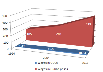 Evolution of nominal wages in CUCs and Cuban pesos