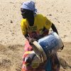 Side-by-side with fellow male villagers, Enia Tambo uses a white 25-liter plastic bucket to dig out mounds of sand in the Vhombozi River, in Mudzi district located in Zimbabwe’s Mashonaland East Province.