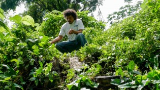 With machete in hand, Salvadoran farmer Damián Córdoba weeds the undergrowth covering the trunk of what was once a leafy tree to show the deforestation taking place on the Santa Adelaida farm, where a company seeks to install a solar park in western El Salvador.